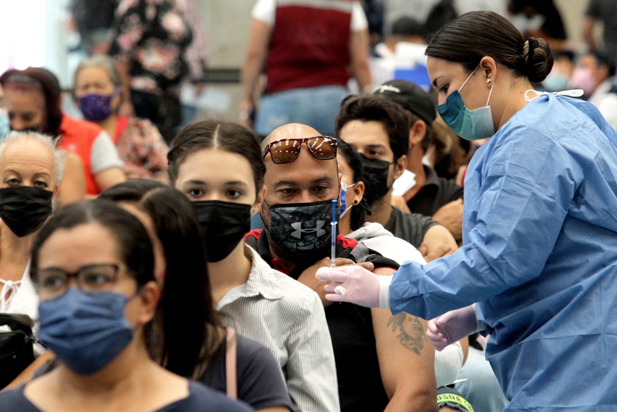 Ao todo, são 68 nações com cobertura abaixo de 40%, que era a meta estabelecida pela entidade para o final do ano passado. No Brasil, percentual da população vacinável com duas doses é de 81%; com o reforço, de 50%. Homem recebe dose de reforço de vacina contra Covid-19 em Guadalajara, no México, no dia 6 de abril.