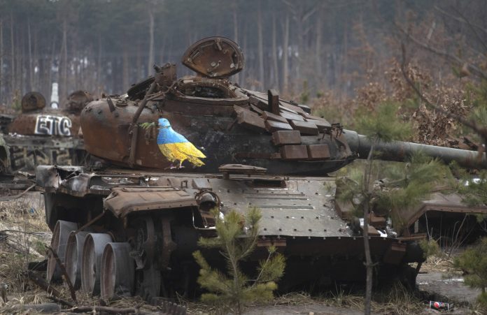 Obra do artista italiano Tvboy sobre a carcaça de um tanque de guerra destruído na vila de Dmytrivka, perto de Kiev, mostra um pombo com as cores da bandeira ucraniana e um ramo no bico