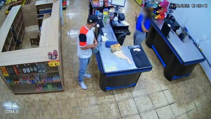 Assaltante ‘limpa’ o caixa de supermercado e ainda foge levando chocolates; VÍDEO