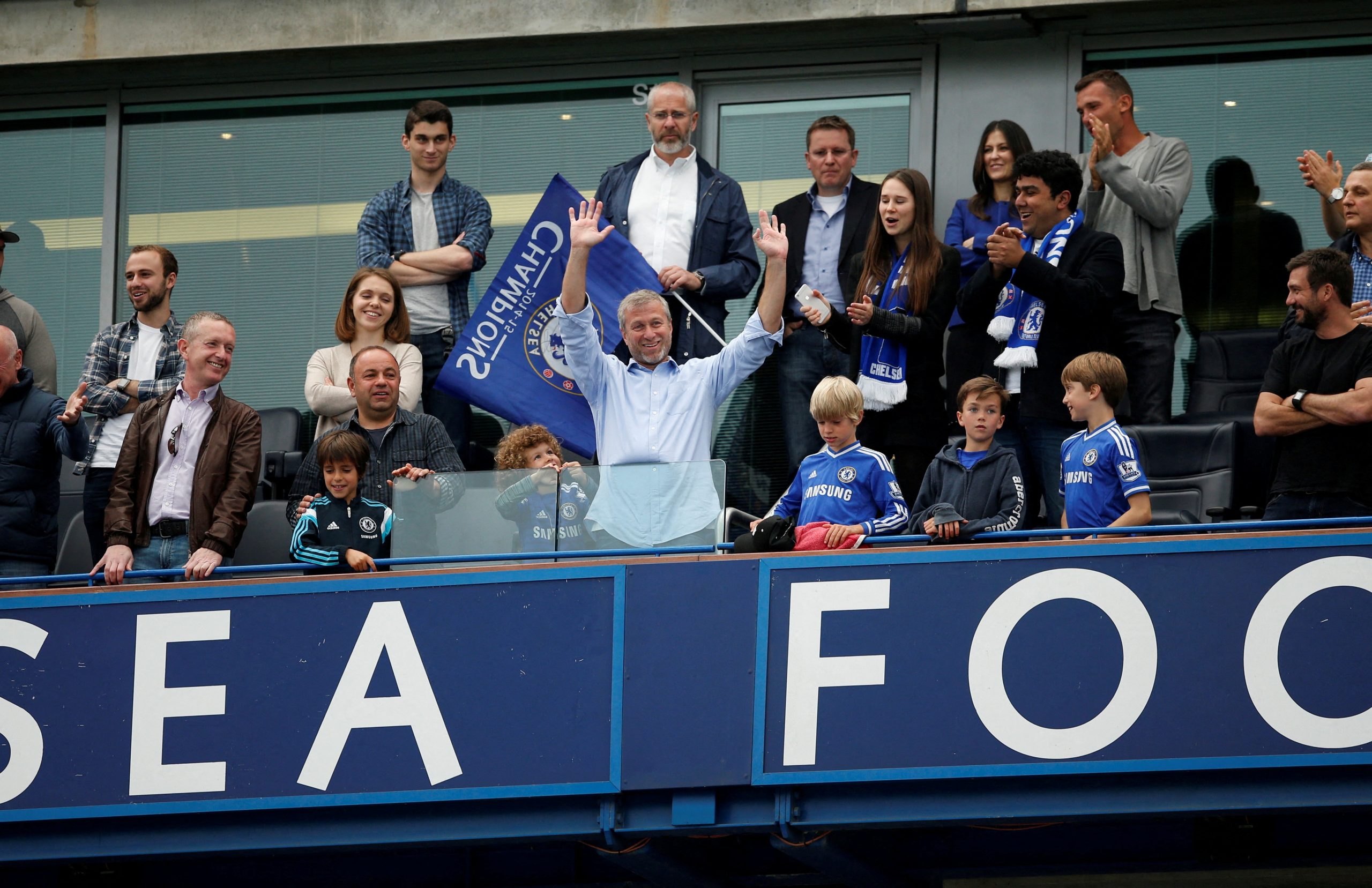 O bilionário russo e dono do Chelsea, Roman Abramovich, comemora gol em partida da Premier League no Estádio Stamford Bridge, em Londres, em 24 de maio de 2015