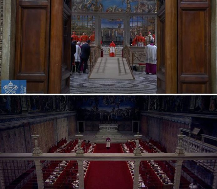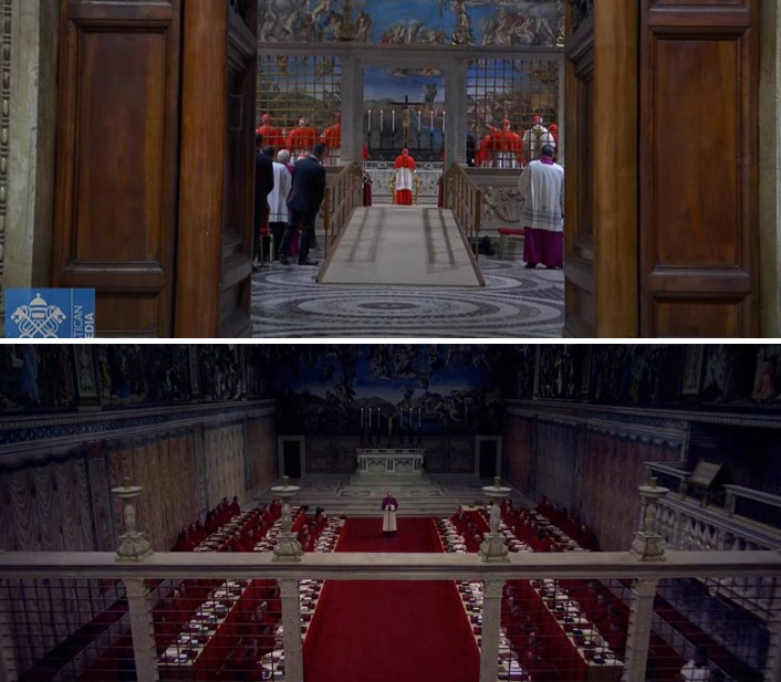 Em uma transmissão ao vivo, às 11h30 do horário de Brasília, o Vaticano exibiu o momento em que todos se encaminharam ao local em procissão. Antes de iniciar cerimônia, os cardeais fizeram um juramento de sigilo.