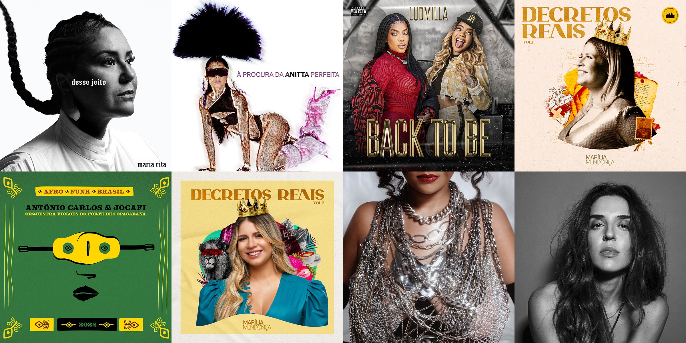 E por falar em funk, duas estrelas do gênero também lançaram EPs em 2022, sem vínculos com álbuns. Anitta apresentou em 30 de novembro o EP À procura da Anitta perfeita, com seis músicas gravadas em português para o mercado nacional. Oito meses antes, em 23 de março, Ludmilla evocou o passado nos bailes funks com o EP Back to Be, de título alusivo ao fato de a cantora fluminense ter entrado em cena com o nome artístico de MC Beyoncé.