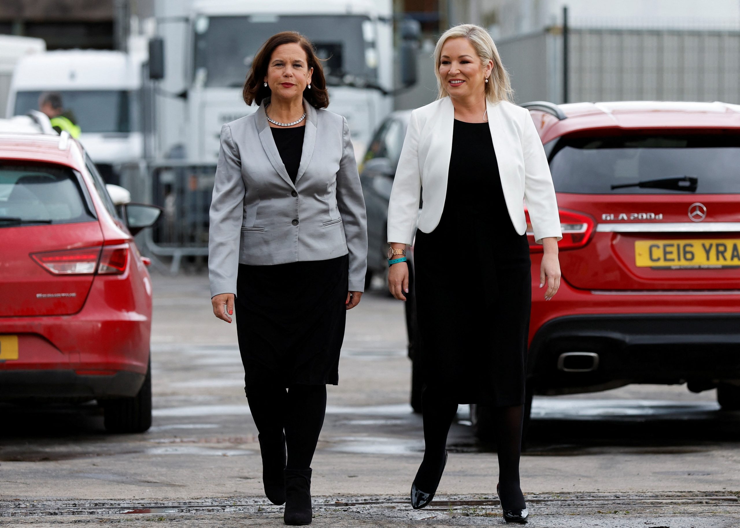 O partido representa aqueles que querem que a Irlanda do Norte se separe do Reino Unido. Michelle O’Neill e Mary Louise McDonald, vice-líder e líder do Sinn Fein, em Belfast, em 6 de maio de 2022